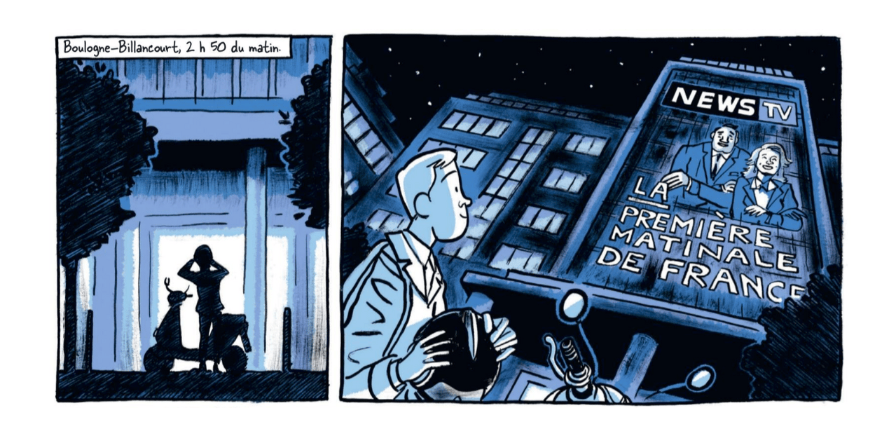 Pierre Millet-Bellando : Honnêtement, ça m’est venu tout à faire naturellement. La fiction me permet de faire des blagues, bien que tout ce que je raconte soit basé sur du réel. À partir du moment où tu fais le choix de la satire, c’est compliqué de donner les vrais noms des gens. Je ne peux pas dire que cette chaîne [ndlr : News TV dans la BD] est BFM TV. Car mes personnages sont caricaturés, bien que très largement inspirés de mon expérience là-bas.